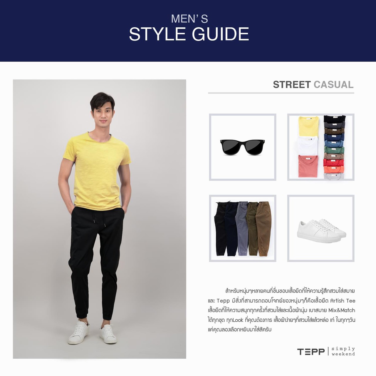 แต่งตัวผู้ชายให้ดูรอดทุกสถานการณ์เทคนิคที่ 1 สำหรับผู้ชายหลายคนที่ชื่นชอบเสื้อยืดที่ให้ความรู้สึกสวมใส่สบายและ Tepp มีสิ่งที่สามารถตอบโจทย์ของหนุ่มๆ ก็คือเสื้อยืด Artish tee เสื้อยืดที่ให้ความสนุกทุกครั้งที่สวมใส่และมีเนื้อผ้าที่นุ่ม เบาสบาย Mix & Match ได้ทุกชุด ทุกลุค ที่คุณผู้ชายต้องการ เสื้อผ้าง่ายๆ ที่สวมใส่แล้วหล่อ เท่ ในทุกๆ วันไม่ว่าจะใส่กับกางเกงขาสั้นหรือขายาว เสริมเครื่องประดับด้วยแว่นตา ก็ทำให้คุณผู้ชายดูหล่อได้ง่ายๆ รอดกับทุกสถานการณ์แค่คุณผู้ชายเลือกหยิบมาใส่