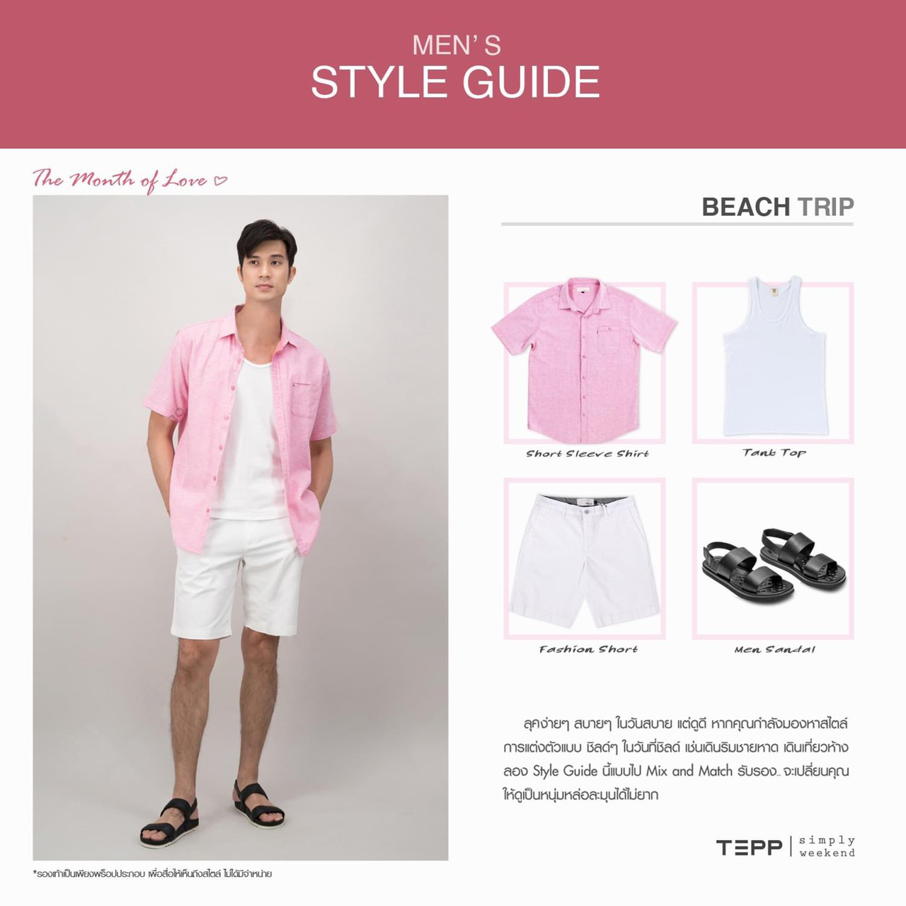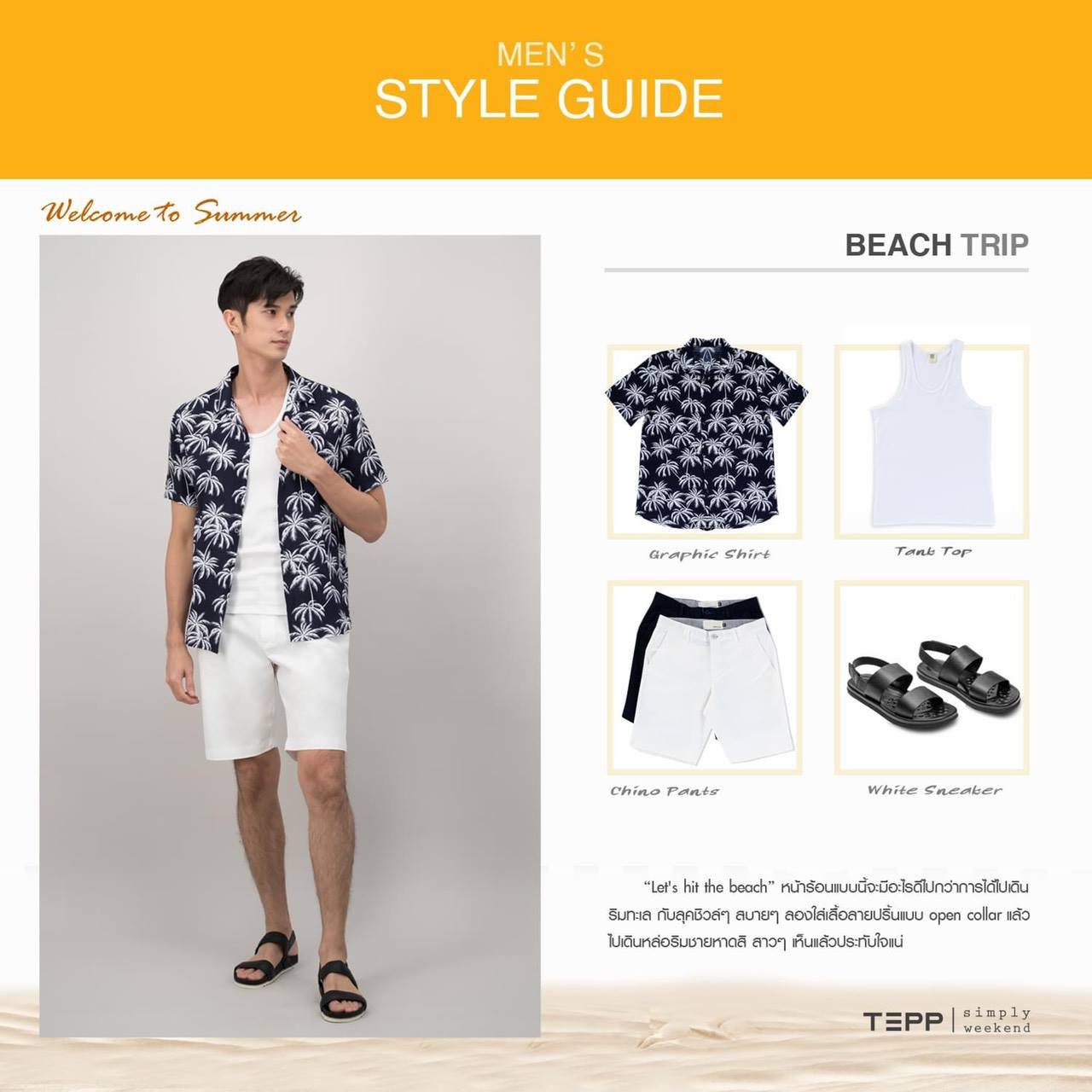 แต่งตัวผู้ชายให้ดูรอดทุกสถานการณ์เทคนิคที่ 2 สำหรับลุคง่ายๆ สบายๆ ในวันสบายแต่ดูดี หากคุณกำลังมองหาการแต่งตัวแบบ ชิลด์ๆ ในวันที่พักผ่อน เช่นเดินริมชายหาด เดินเที่ยวห้างลอง Style Guide นี้ไป Mix & Match โดยการใส่เสื้อซับในสวมทับด้วยเชิ้ตแขนสั้นสีสดใสมาแมทซ์กับกางเกงสีขาว หรือจะเพิ่มเครื่องประดับเป็นหมวกหรือแว่นตา รับรองจะเปลี่ยนให้คุณดูเป็นหนุ่มหล่อละมุนได้ไม่ยาก