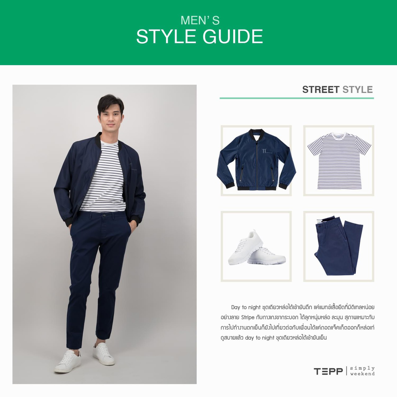 แต่งตัวผู้ชายให้ดูรอดทุกสถานการณ์เทคนิคที่ 4 “Day to ningt” ชุดเดียวหล่อได้เช้ายันดึก แค่แมทซ์เสื้อยืดที่มีดีเทล อย่างลาย Stripe กับกางเกงขากระบอก ได้ลุคหนุ่มหล่อ ละมุน สุภาพเหมาะกับการไปทำงานตกเย็นก็ยังสามารถไปเที่ยวต่อกับเพื่อนได้แค่ถอดแจ็คเก็ตออกก็ดูลุคที่สบาย หรือจะใส่แจ็คเก็ตเสริมเพื่อเพิ่มความหล่อมากยิ่งขึ้น ใส่ไปไหนก็รอดแถมยังรอดได้ทุกสถานการณ์