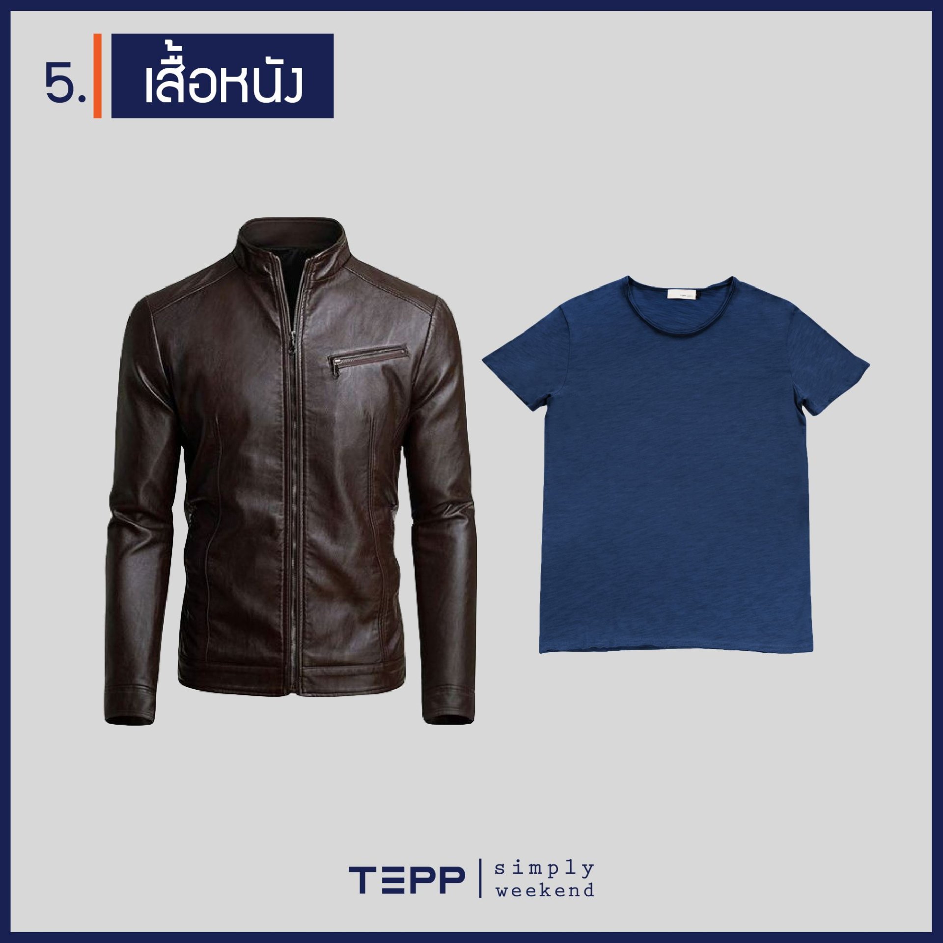 5.แต่งตัวผู้ชายด้วยเสื้อยืด Artist Tee สวมทับด้วยเสื้อหนัง เอาใจหนุ่มไบค์เกอร์ โดยการเลือกเสื้อหนังนั้นไม่ควรที่จะเลือกเสื้อหนังที่มีขนาดใหญ่เกินไปเพราะมันจะดูเทอะทะ แถมดูตลกมากกว่าความเท่ และดูเรื่องของการจับคู่สีของเสื้อยืด Artist Tee กับเสื้อหนังของคุณผู้ชายด้วยนะคะ