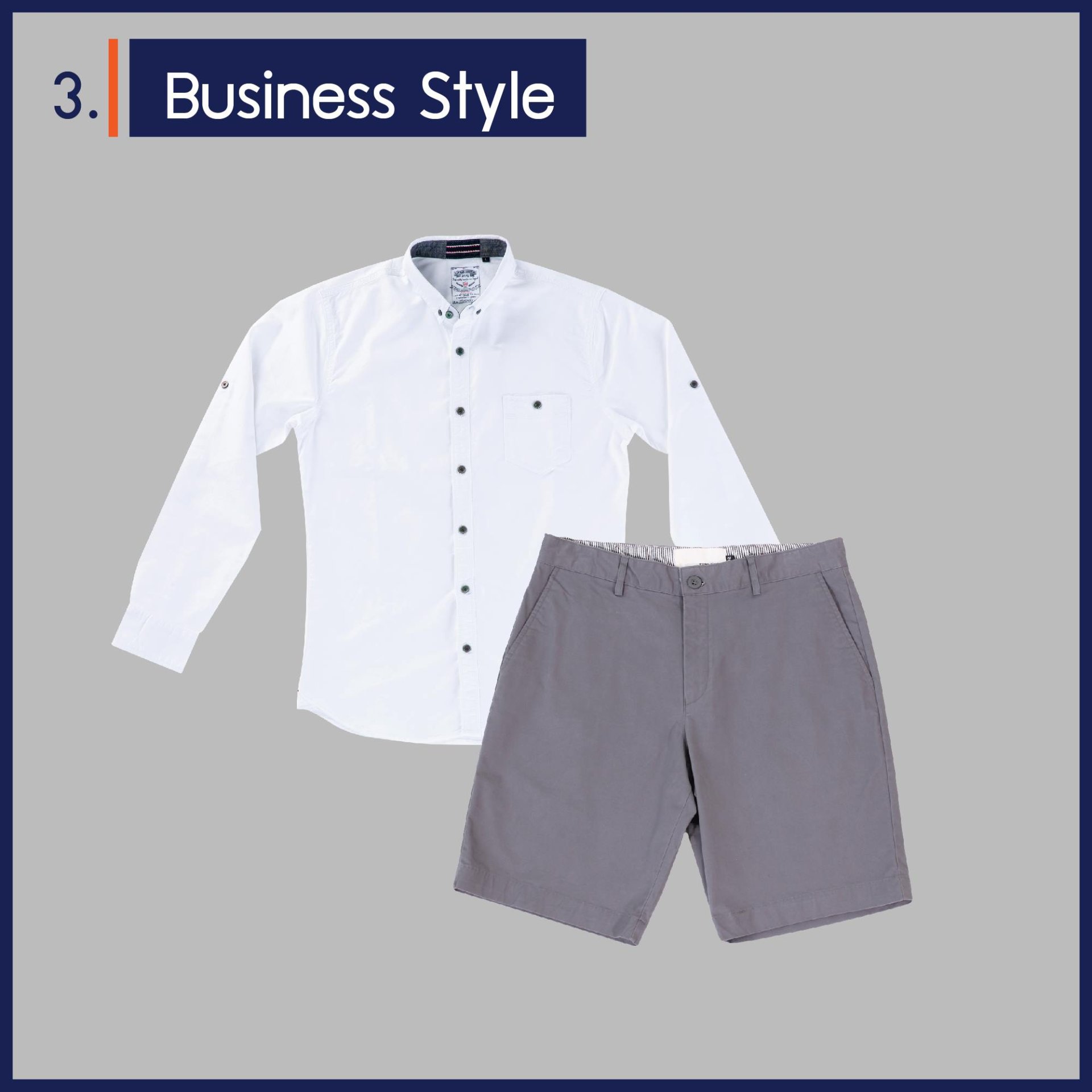 แม้ว่าจะกางเกงขาสั้นจะดูไม่ค่อยสุภาพเรียบร้อย ไม่เหมาะสำหรับลุคการแต่งตัวที่มีความเป็นทางการ แต่รู้หรือไม่? ว่ากางเกงขาสั้นบางยี่ห้อ บางรุ่นก็มาพร้อมกับเนื้อผ้าคุณภาพเยี่ยมและคัตติ้งสุดเนี๊ยบที่พร้อมจะช่วยให้ลุคการแต่งตัวของคุณดูดีมากกว่าเดิม โดยเฉพาะถ้าคุณได้ลองแมทช์กางเกงขาสั้นกับเสื้อเชิ้ตหรือสวมใส่สูท เบลเซอร์ทับแล้วล่ะก็ รับรองว่าช่วยเสริมลุคให้ดูกึ่งทางการสุขภาพเรียบร้อยมากกว่าเดิมอย่างแน่นอนค่ะ แต่เวลาเลือกมิกซ์แอนด์แมทช์ Business Style นั้นควรเลือกกางเกงขาสั้นที่มีสีพื้น เรียบง่ายเช่นสีดำ สีขาว สีเทา สีกรมท่า สีเบจ สีน้ำตาล เป็นต้น รวมถึงควรคอมพลีทลุคด้วยรองเท้าหนังรูปทรงต่าง ๆ จะเป็น Oxford Shoes หรือ Loafers หรือรองเท้าผ้าใบที่ทำจากหนังดีไซน์หรูหราที่ซ่อนความเท่ดูดีมีระดับไว้ได้อย่างเต็มที่ก็ได้เช่นกัน